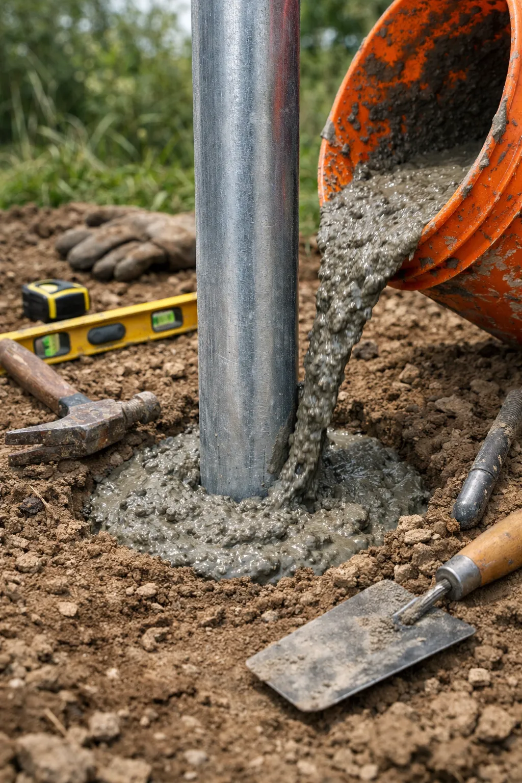 Бетонирование. Яма Ø250-300 мм, глубина 1.2-1.5 м. На дно — щебень 10-15 см (дренаж). Столб устанавливается строго вертикально, заливается бетоном М200. Самый надёжный способ, особенно на пучинистых грунтах.